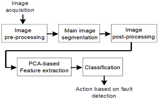 The identification of a PV system tracker fault through the detection of the PV panel’s slope can be realized by a simple photograph instead of the use of complex methods. So, in association, a pattern recognition method must be used. In this case, an approach for the feature extraction that uses the principal component analysis (PCA) is proposed, stressing that the PCA has been used in many industrial applications [40,41,42,43]. However, it has not yet been used in image processing to detect slopes of certain objects, as is the case of this problem. So, for the implementation of this approach five main steps were considered, more specifically: image pre-processing, main image segmentation, image post-processing, PCA based feature extraction and feature based classification. The steps of the proposed approach can also be seen in Figure 3.