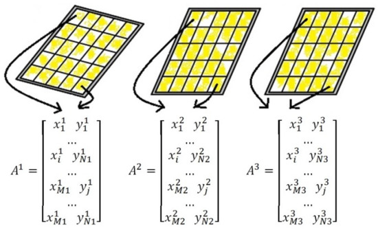 The number of significant samples, Mi, corresponds to the number of rows of the matrix Ai. The number of rows of the matrixes A1, A2 and A3 is different and depends on the number of points of each PV module, obtained after the threshold and clustering procedures. The first column of each matrix has the x coordinate of each point and the second column has the correspondent y coordinate of that point. Before applying the PCA algorithm, it is necessary to subtract the mean from each of the two data dimensions x and y. The mean subtracted, , is the average across each dimension (3). So, all the x coordinate values have a mean value subtracted, and all the y coordinate values have a mean value subtracted from them. This produces a new data set, , whose mean is zero (4).