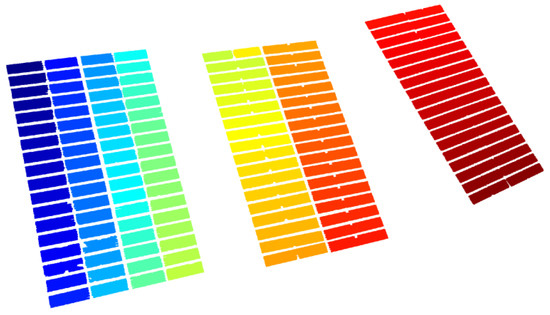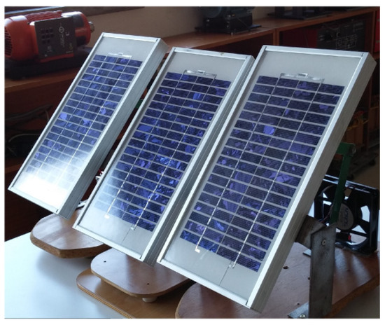 The first case study used to verify the capability of the approach to identify the panels and their slopes, considers the condition in which all the trackers of the panels do not present any fault. In Figure 6, the image that was used for this test is presented. From this image, it is possible to see that all the panels present the same orientation indicating that there are no faults in the trackers. As referred previously, first the image processing was used to identify and isolate the PV panels that are inside the photograph. The result of this processing can be seen in Figure 7, in which it is possible to confirm that the panels were isolated from the rest of the image information. One of the aspects that can be seen by this figure is that some of the cells of the PV panel were not identified. This is due to the reflections that appear in PV modules. The orientation of each panel, θi, is determined by the principal component of the points that belong to it. To assign each point to the correspondent panel the clustering algorithm described above was used (Equations (1) and (2)). Considering that three PV modules exist, three clusters, with the distance as a criterion, were then constructed. In Figure 8, the assignment of each cell points to a PV module and the correspondent orientation of the principal components are shown. Through this figure it is possible to see the attribution of each point to each panel through the application of the clustering process.