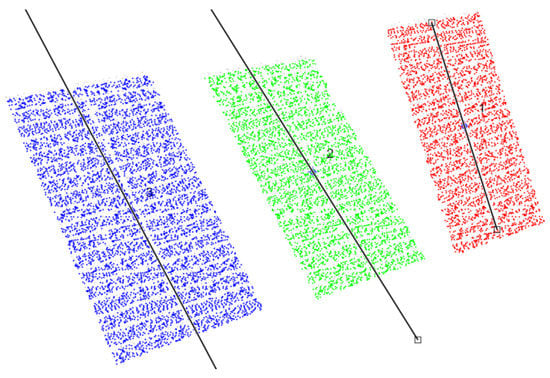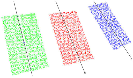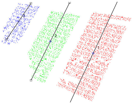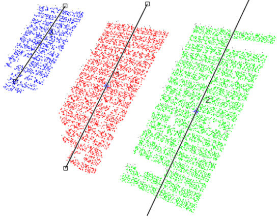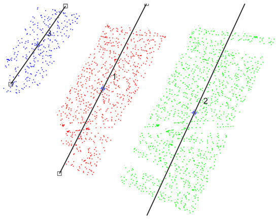 A third case study with a different fault was also realized. This test is related to a fault in the PV panel located on the right (PV Module 3) and with a horizontal fault. In Figure 12, the image associated with this case study is presented, and it is possible to confirm the location and different orientation of the PV with the fault in the tracker. The identification of each of the three PV panels by the developed algorithm can be seen in Figure 13. In fact, that figure confirms the removal of the information that does not belong to the PV panels. The assignment of each point to the correspondent PV module and the correspondent principal component can be seen in Figure 14. This figure confirms that the points were correctly assigned to the PV modules and that the principal component follows the slope of each PV panel.