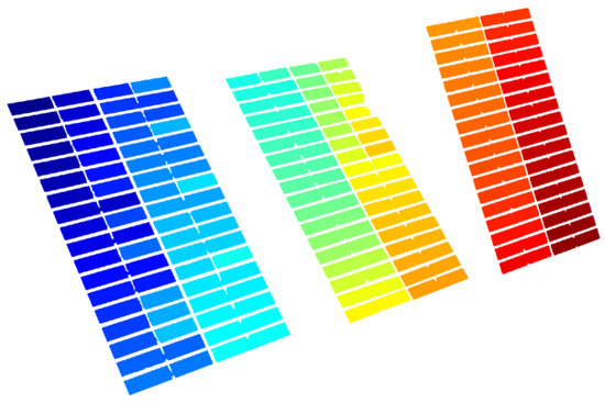 The second case study is related to a condition in which there is a fault in one of the trackers. The image associated with this case study is presented in Figure 9. Verifying this photograph, it is possible to see that the PV module located on the right (PV Mod. 1) presents a different orientation when compared with the other two. The fault is associated only with the vertical axis of which the different orientation is related with that axis. Applying the image treatment to this figure, the identification of each of the three PV modules was obtained, as shown in Figure 10. Indeed, this figure shows that the image information that does not belong to the PV panels was removed. Regarding the step in which each of the points are assigned to the correspondent PV module, the corresponding result can be seen in Figure 11. This result shows the principal component obtained for each of the PV panels. Analyzing the resulting image, it is possible to see that the principal component follows the slope of the PV panels.
