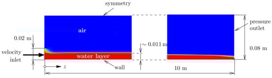 ANSYS Fluent has correlations describing the mass transfer coefficient but they are oriented to flow past spherical particles (bubbles) like Ranz–Marshall or Hugmark models [21]. These models are not suitable for this case of moving thin-water layer, therefore constant values of mass transfer coefficients were used instead. The gas side mass transfer coefficient was approximated using the correlation describing the flow along a flat plate as . To determine the mass transfer coefficient on the liquid side, a separate CFD simulation describing the flow of the thin water layer with constant height was performed. In general, the mass transfer coefficient depends on the location, as it is illustrated in Figure 2.