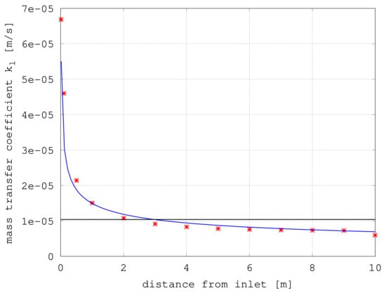 At the locations near the the inlet, the values of the mass transfer coefficients are much larger than further from the inlet (theoretically, infinitely large for zero distance). The average value over the whole length (10 m in this case) was evaluated from an overall mass balance as in this case, which corresponds to the experimental value already measured in [12]. Its value is much smaller than the gas-side coefficient, therefore the resistance to mass transfer is much larger in the liquid phase and we can safely assume that the overall mass transfer coefficient will be almost equal to the liquid-side mass transfer coefficient, that is, . The dependency of the mass transfer coefficient (on the liquid side only) illustrated on Figure 2 could be described by the following equation: