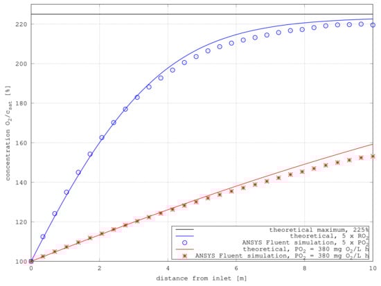 Concentration profiles of dissolved oxygen along the thin-layer reactor (along almost horizontal line traced 5 mm from the bottom) and comparison of CFD simulations results with solution of Equation (7). Two variants of maximum value are depicted here, the basic value , and 5 times larger value approaching the maximum possible concentration representing 225% of the saturated value (depicted as horizontal line at the top of the figure).