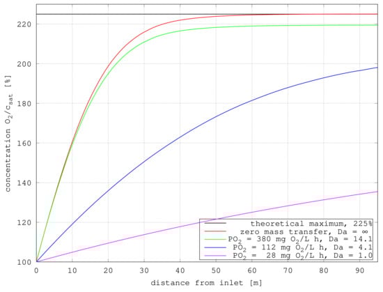where represents a variant of the Damköhler number, widely used in chemical engineering. Here, it represents the ratio of the reaction rate and mass transfer rate. The larger is the reaction rate compared to the mass transfer rate, that is, the larger is the value of the Damköhler number, the smaller is the impact of the mass transfer on the results, and vice versa. With zero mass transfer, that is , Equations (9) or (10) will result in concentration profile of dissolved oxygen approaching . It is illustrated on Figure 4, where it is compared with other values of reaction (production) rate and corresponding Damköhler number.