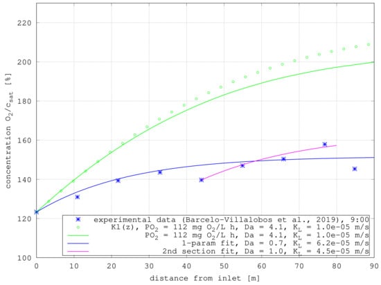 However, concerning the experimental data, there is a visible drop in the concentration between 40 and 50 m distance, which corresponds to the transition between two 40 m long sections of the whole system [11]. Applying the fitting procedure to the data points in the second section only (excluding the last point which was probably in the sump already), the appropriate value of the mass transfer coefficient would be (with 17.5% confidence interval), which is smaller than the fitted value for the whole system. This is in accordance with the fact that at the beginning of the system, the mass transfer coefficient is larger due to entrance effects. The dependency of mass transfer coefficient on the distance was already illustrated on Figure 2 and described by Equation (5). As it was based on CFD simulation for a 10 m long system only, it would not make sense to apply it to the much longer 80 m system [11]; nevertheless, the top-most green points in Figure 5 illustrates the impact of this dependency on the concentration profile of the dissolved oxygen. It clearly shows that the decreasing value of the mass transfer coefficients along the system length yields in larger concentrations of the dissolved oxygen in the liquid phase. Of course, with longer system the dependency on distance would be different, fitting the experimental data depicted in Figure 5 gives the following correlation: