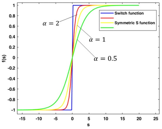 where α > 0, and its value determines how fast the value of the symmetric S-type smooth function changes near the origin. The switch and symmetric S-type function are shown in Figure 2. When α is infinite, can be converted to a switch function, which can cause large chattering. When α is very small, the boundary layer thickness is large, the system convergence is slow, and the robustness is poor. To meet the requirements of the high precision and good robustness of the system, α = 2 is selected in the study. This maintains the switching characteristics of SMC and effectively reduces the discontinuity of the system, thereby reducing the chattering and improving the disturbance rejection ability.
