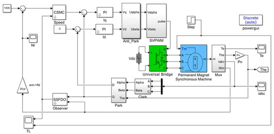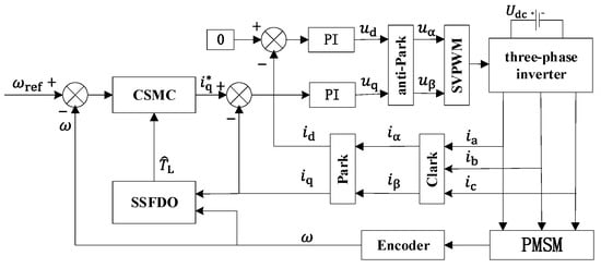 In this study, the new reaching law and continuous symmetric S-type function are used in the new sliding mode controller designed. The speed of the reaching phase is accelerated, the time to reach the steady state is reduced, and the chattering of the system is reduced to some extent. However, the influence of the external load disturbance and internal parameter change on the system is ignored. In order to improve the disturbance rejection ability of the system, the SSFDO is used to observe the change in load disturbance in real time. The observation torque is feedforward compensated to the new sliding mode controller to form a compound sliding mode controller, enhance the control effect, and improve the robustness of the system. Finally, the expression of the CSMC based on the SSFDO is shown in Equation (25), whereas the overall system control block diagram is shown in Figure 4.