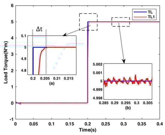 In order to verify the observation effect of the load disturbance observer, the motor is set to start without the load and the load torque is suddenly applied at . The gain values in SSFDO are , , and . The observation results are shown in Figure 6, where TL is the given torque waveform and TL1 is the observation torque waveform. Figure 6a shows the response time when the observation torque reaches the given torque value. Figure 6b shows the fluctuation of the observed torque. The cogging torque is caused by the special structure of the PMSM motor, which fluctuates the observed torque. Based on the annotation of (a) in Figure 6, the convergence time and convergence rate is fast. It can be seen from Figure 6b that the fluctuation amplitude range is between , the waveform oscillation is small, and the observation accuracy is high.