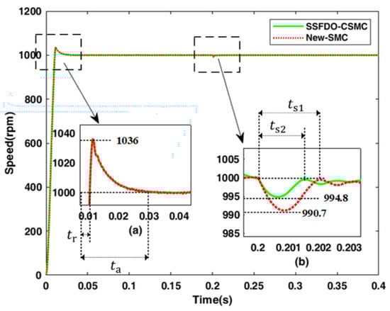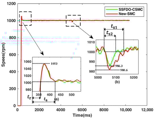 In Figure 7, the speed change in the new SMC with or without the observation disturbance is compared. “New-SMC” represents the speed change curve under the control of the new sliding mode controller designed, whereas “SSFDO-CSMC” represents the speed curve under the compound sliding mode controller with the symmetrical S-type function disturbance observer. Figure 7a shows the starting performance curve of the motor and Figure 7b shows the disturbance rejection ability of the motor.