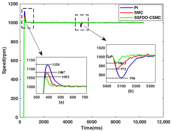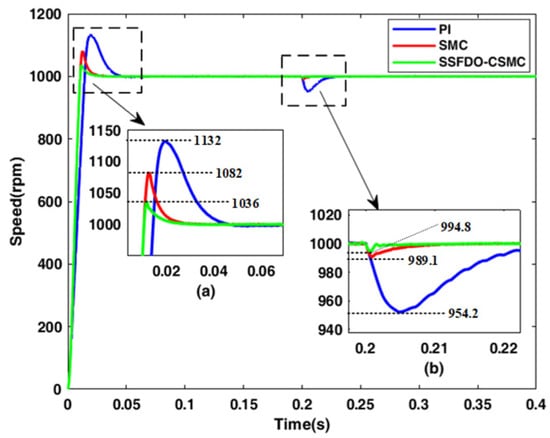 The starting speed performance and disturbance rejection ability of PMSM are simulated using the above three control methods. The speed changes are shown in Figure 9. Figure 9a shows the starting speed performance curve of the motor and Figure 9b shows the disturbance rejection ability of the motor.