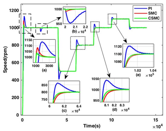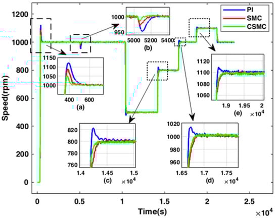 The results in Figure 10 show that the CSMC has the best tracking performance under the speed step with a constant torque of . Compared with the PI control and traditional SMC, the CSMC can reach the target speed quickly and without overshoot.
