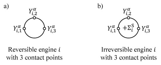 As opposed to reservoirs, at the contact points of an engine, the intensities’ values generally differ so that all of these balance equations are fulfilled. This is an essential feature that allows engines to reversibly transfer energy between different intensity levels. As schematically shown in Figure 2a, engines are usually illustrated as circles.