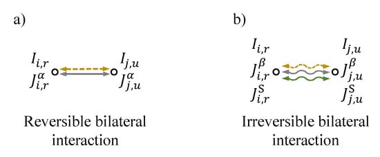 Reversible interactions are illustrated by straight arrows, whereas irreversible interactions are illustrated by wavy arrows. In the following, we will consider two essential examples of irreversible bilateral interactions that will be needed later.