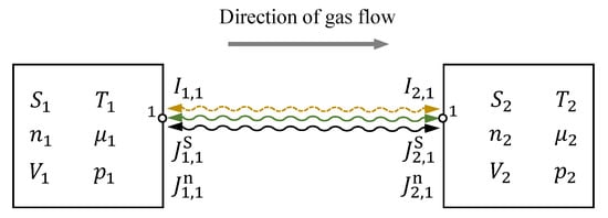 The gas flow is represented by a multi-extensity flux that consists of a particle flux and a correlated entropy flux . The overall energy flux (enthalpy flux) carried by this multi-extensity flux is . We consider the flow direction where . Mass conservation and energy conservation read: