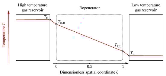 with the dimensionless coordinate and the contact point temperatures as depicted in Figure 6. For homogeneous mass density and homogenous specific heat capacity , the energy of the regenerator becomes: