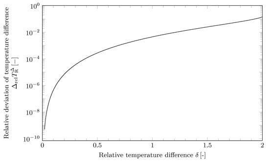 It can be observed that the relative deviation of the temperature difference introduced by the approximation from Equation (24) is smaller than for a relative temperature difference . For a relative temperature difference of , the relative deviation is still smaller than . Since this is assumed to hold in a broad range of model situations, the deviations entailed in Equations (25) and (26) are regarded as negligible.