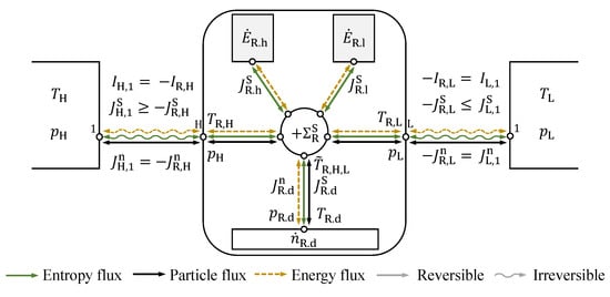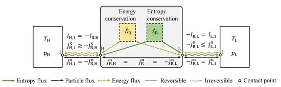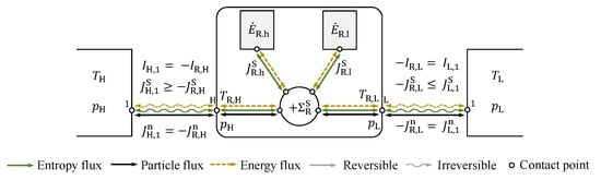 Here, and are entropy fluxes entering the regenerator at the contact points H and L. Together with the particle fluxes and , they carry the energy fluxes and , respectively. Furthermore, is the sum of all internal entropy sources which can for now taken to be zero (internally reversible regenerator). It is the placeholder for internal irreversibilities that will be addressed in Section 5.
