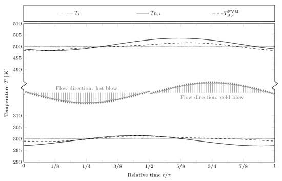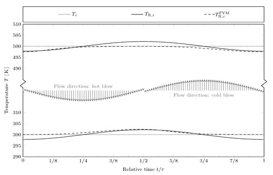 Additionally, to provide a benchmark, in Figure 9, the results of a finite volume regenerator model using 200 regenerator layers are plotted with dashed lines. Each of those layers consists of a gas reservoir, which represents a slice of the regenerator dead space (measuring L in total) and is linked by a non-resistive-heat-transfer interaction to a dedicated heat reservoir representing the respective slice of the matrix. Correspondingly, and are the temperatures of the two outermost slices that are connected to the adjacent gas reservoirs H and L.