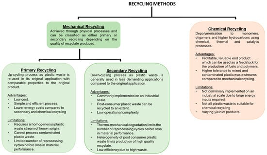 - Grigore, M.E. Methods of recycling, properties and applications of recycled thermoplastic polymers. Recycling 2017, 2, 24. [Google Scholar] [CrossRef]