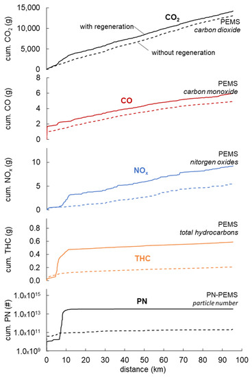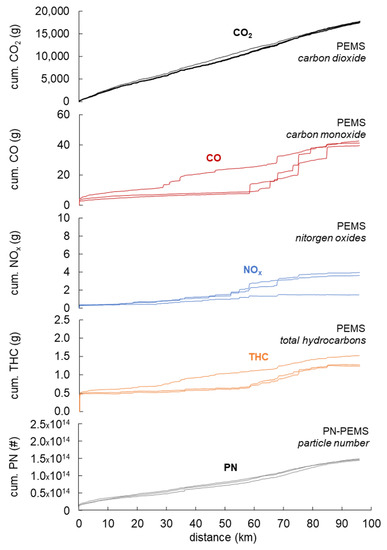 Figure 1 shows an example of cumulated RDE results obtained with the gasoline vehicle (V1) in winter driving conditions. There were, respectively, three repetitions performed on the official RDE-circuit. Some emissions differences between the repeated tests are caused by different traffic situations and driving behavior. Especially stronger accelerations, mainly in the urban part, can produce higher emissions increments.