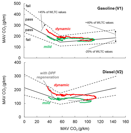 Figure 6 shows the CO2-normality check for both vehicles. The normality check that is the comparison of CO2 emissions during the RDE-measurement using MAW with the reference CO2-emissions obtained on the chassis dyno during the WLTC. For the gasoline vehicle (in the top part of the figure), there are clearly higher CO2-values at dynamic driving, but the trips and their dynamic conditions are entirely normal since the characteristic curves are not exceeding the primary tolerance band of +45(40)/−25% (of the average WLTC-CO2-values). The CO2-normality check for diesel vehicle is represented in the bottom part of the figure. In the highest speed range and with “mild” operation, the characteristic line exceeds the primary tolerance domain +45(40)/−25%. In one of the trials with “mild” operation, DPF regeneration happened. This had consequences on CO2-values and caused them to exceed the primary tolerance band as well at the lowest speed range. It can be concluded that: