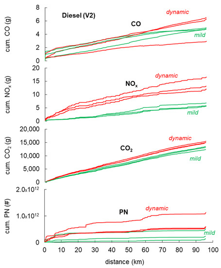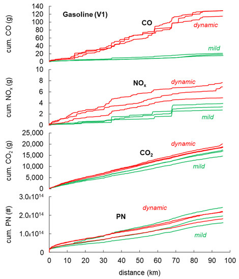 Figure 7 represents the influences of driving style on the cumulated emissions of CO, NOx, CO2, and PN of the gasoline car for, respectively, three “mild” and “dynamic” tests. The following relationships can be remarked: