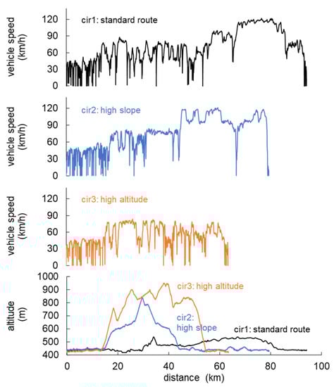Speed and altitude profiles of the used test circuits: cir1-standard route, cir2-high slope, cir3-high altitude, gasoline (V1).