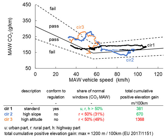 For the test circles used in the present work, it must be remarked that, principally, the rural part was decisive for the influences of slope and altitude. The city and highway parts were always the same and more or less flat. The variations of altitude have impact on the final results by increasing or decreasing the work amount provided by the vehicle. Figure 11 illustrates the validity check of the three used routes/trips. The trips “cir2” and “cir3” with higher altitude variations do not fulfill entirely the CO2-normality, exceeding the primary tolerance band of +45(40)/−25% in the middle speed range.
