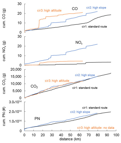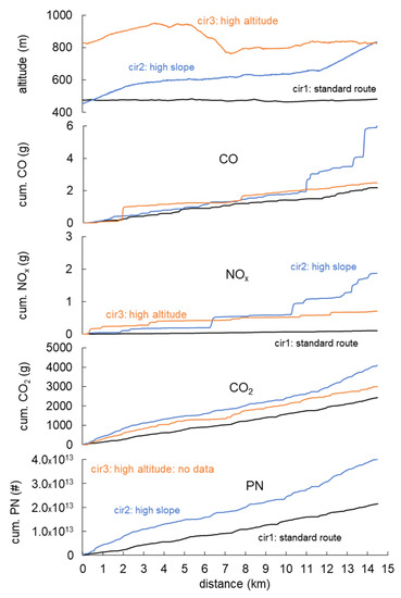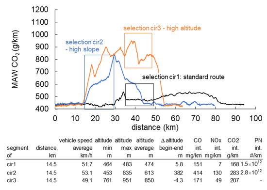 In order to better discriminate the influences of the altitude and the slope on the emissions, selected parts of trips were taken into consideration. Figure 13 represents the selected segments, all of them with the same driving distance (14.5 km) and with similar average speed (approximately 51 km/h). In this way, the segment chosen from the cir2 represents predominantly the high slope and the segment chosen from the cir3 represents mainly the high altitude. The results of evaluations with this part selection are given in Figure 14. The representation is analogous as in the Figure 12. The statement about increasing the measured emissions by higher slope and/or altitude can be extended to all components. The sharp increases of CO and NOx in the diagram for cir2 and cir3 can be attributed to the dynamic driving events combined with higher power demand for the slope. Higher slope (cir2) in this comparison needs more energy and emits more CO2 than the high-altitude profile (cir3).
