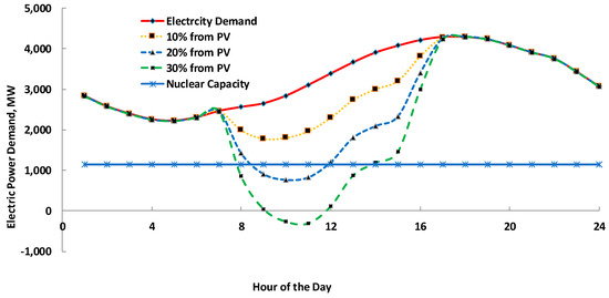 The higher penetration of renewables in electricity grids causes a commensurate decrease in the power demand for the non-renewable electricity generating units during the early morning hours—a time period when the A-C energy consumption is low, and the irradiance is very close to its (flat) peak. Figure 1 depicts the electric power demand in the San Antonio, Texas, area on a typical day in the summer. It is apparent that the demand exhibits a flat maximum in the afternoon hours when the temperature and A-C utilization are very high. The electric power demand in this area is currently satisfied by a combination of coal, natural gas, nuclear, solar, and wind power plants. The figure also depicts the power demand from the non-renewable energy sources if there was significant solar capacity addition in the area so that solar installations generated 10%, 20%, and 30% of the annual electric energy. In this case, the non-solar power units would have to reduce or altogether stop supplying power during the morning hours when the irradiance is high, and the A-C energy demand is still low, causing the total electric power demand to also be low. The higher penetration of the renewable PV-generated energy creates the so-called duck curve [17,18], and places severe constraints on the base-load units, and, especially, on the nuclear power plants, which operate with Rankine cycles that are difficult to adjust in short timescales but do not emit CO2, and are essential in the decarbonization of the electricity-generating sector [2,19,20,21].