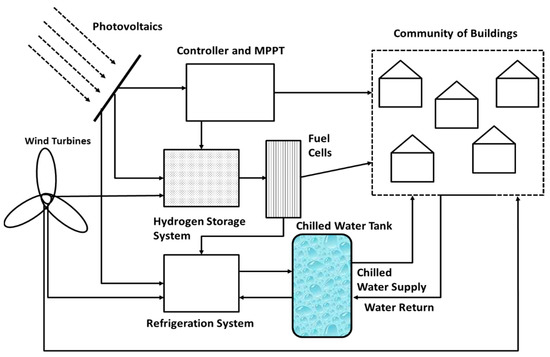 Thermal storage systems are complex and costly. For this reason, thermal storage systems have not been developed for individual households but for large buildings (hotels and commercial buildings) as well as clusters of larger buildings. For this study, a community of 2000 homes (the size of a small town) has been chosen in the North Texas area, an area rich in solar and wind resources. For the energy storage that is converted to electricity, a hydrogen system has been chosen. This choice was made because the region does not have any suitable geological formations for Pumped-Hydro Storage or Compressed-Air Energy Storage [26,27] and because battery storage is not suitable for the seasonal storage of energy—e.g., from winter and spring, when the winds are stronger, and there is a great deal of irradiance to the summertime, when A-C energy is needed. Figure 1 depicts the schematic diagram with the main equipment and systems that would make this community grid-independent: an array of PV cells and a small number of wind turbines supply all the energy needs for the community. Power controllers and a series of Maximum Power Point Trackers (MPPT) are installed to ensure maximum electric power generation by the solar arrays. Depending on the hourly supply and demand for power, the generated power is suitably directed to the community of the buildings, to the refrigeration system (for chilled water production), or to the electrolysis system, which produces the hydrogen and stores it in pressurized tanks. The demand of the cluster of buildings has first priority; the refrigeration system has second priority in the allocation of power. If there is any remainder, the energy is stored in a hydrogen storage system. It must be noted that actual systems to be developed may have a number of chilled water tanks and hydrogen tanks strategically placed among the buildings of the community to optimize the overall operation of the system.