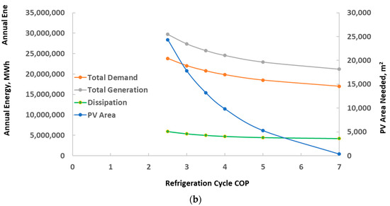Calculations were performed with the COP of the chilling system as a parameter in the range of 2.5–7. It must be noted that when the average COP increases, the electricity consumption for A-C decreases, and so does the annual electricity demand in the cluster of buildings. Figure 3a,b depict the annual energy demand and supply, the annual energy dissipation, and the PV area needed for the solar part of the energy generation system, when the COP varies in the range 2.5 to 7 and when one or two wind turbines supply the wind part of the generation system. Calculations with the employment of three wind turbines were not conducted because three turbines would cause energy to over-supply at the higher values of the COP. It is observed in the two Figures that higher COP values significantly decrease the total annual demand for electricity, with corresponding decreases in the electric energy that needs to be generated and the annual dissipation of energy. It is also observed that (when the wind generation is constant) the PV requirements for the cluster of buildings significantly drop with the COP of the refrigeration cycle.