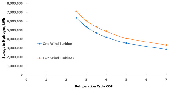The hydrogen energy storage depends on the generated and consumed energy and is also a function of the COP. Figure 4 shows the effect of this variable on the energy storage required to ensure the cluster of buildings generates and stores sufficient energy to become grid-independent. It is apparent in Figure 4 that the COP of the water chiller has a profound and very positive effect on the overall need to store energy. It must be noted that more energy storage becomes necessary when two wind turbines serve the cluster because less solar energy is generated, and the latter correlates more with the energy demand. At 50 MPa and 300 K, the energy density of hydrogen is 1.03 MWh/m3. Therefore, when one wind turbine is employed, the needed storage tank corresponds to 1.4 m3 per household when COP = 7, and 1.7 m3 per household when COP = 5. The corresponding figure from Table 1 (in the absence of thermal storage) is 3.5 m3. One may conclude that the installation of thermal storage significantly reduces the amount of any other energy storage system needed.