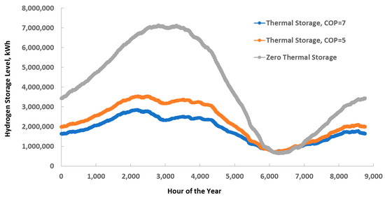 The level of hydrogen storage throughout the year with and without thermal energy storage.