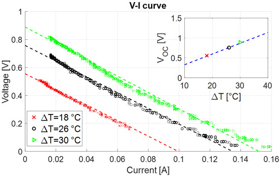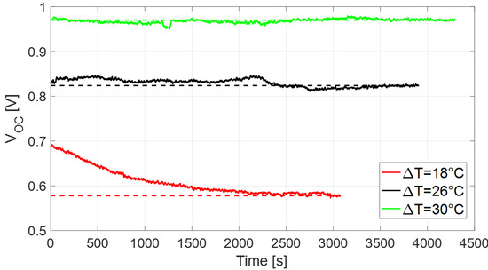 The acquired OC voltages are shown in Figure 2: the graph associated with the first tested gradient (i.e., T = 18 °C ) shows that a certain time is necessary to stabilize the temperature and, hence, the OC voltage. For the other curves, the related measurements were performed after waiting for the heatsink to reach a stable temperature value, in order to spot out the final constant value after the transient phase.