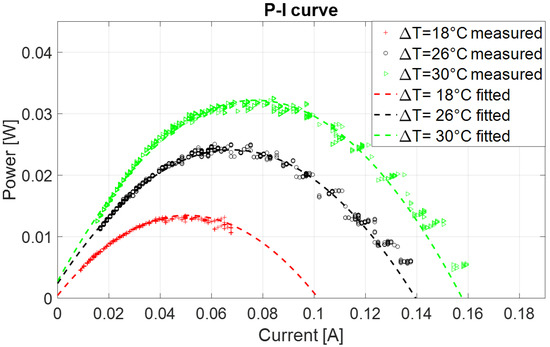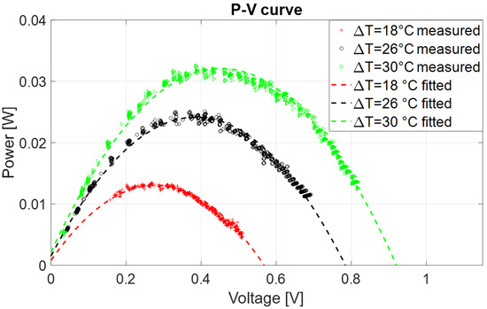 P-V characteristic curve measured (scatter plots) and fitted (dashed lines) at three temperature gradients: T = 18 °C (red plots), T = 26 °C (black plots) and T = 30 °C (green plots).