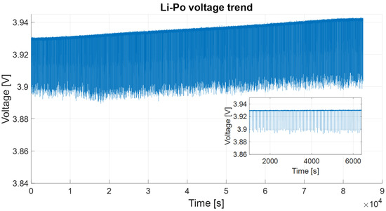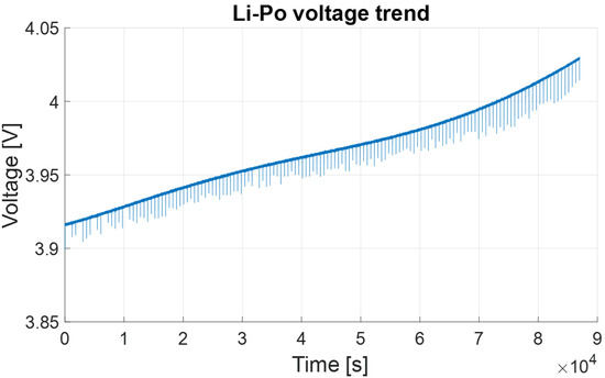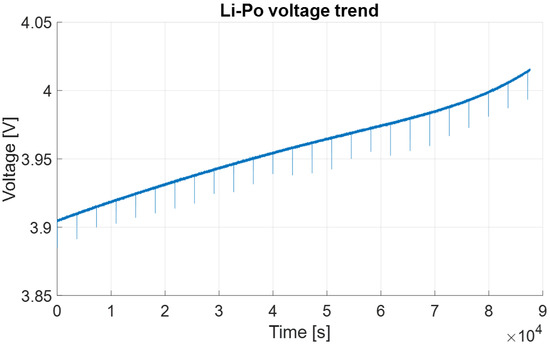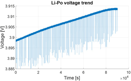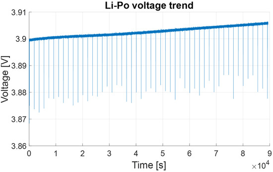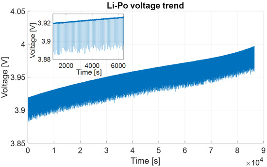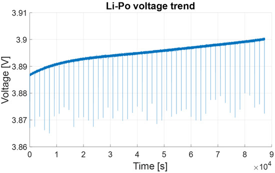 Further analyses were performed involving the new set-up in order to observe the system behavior in case of low-temperature gradients. Figure 11 and Figure 12 show the results of a 24 h long test performed with radio transmissions every 30 min and, respectively, T = 8 °C and T = 5 °C, which is the minimum temperature gradient tested. The Li-Po voltage difference between the start and end of the tests confirms the detected positive charging trend and the energy self-sufficiency of the system: overall, the battery voltage increased respectively by V = 15 mV and V = 5 mV.