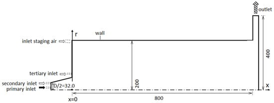 The geometry of the problem as well as the boundary conditions exhibit axial symmetries. This implies that the time-averaged solution, which is sought within the RANS framework, also needs to be axisymmetric. Consequently, the present problem is formulated as a two-dimensional-axisymmetric one, defining the solution domain to be as such. The total furnace length is considerably large compared to burner dimensions (Figure 1). Nevertheless, the measurements [61] indicate that the occurring flames are restricted to a comparably small zone downstream of the burner. Therefore, the whole combustor is not considered, and only a part up to 800 mm after the burner exit plane is defined as the solution domain in the present calculations. In a previous LES analysis of oxy-combustion with the same burner in the same furnace by Sadiki et al. [28], the considered domain size was 600 mm, which implies the sufficiency of the presently considered domain size. An additional issue in defining the solution domain in swirling flows is related to the outlet boundary. Particular attention is required in that respect since it can have a substantial effect on the upstream flow, specifically in the case of a sub-critical flow [63]. From a practical perspective, if a standard, classical “axial outflow” boundary is used at the outlet, convergence problems can easily emerge since the IRZ generated by vortex breakdown may extend to the outlet boundary and cause a reverse flow at the outlet. In order to reduce potential inaccuracies and computational difficulties in that respect, in our earlier investigations, we found [64] that it is suitable to replace the axial outlet with a radial outflow boundary without influencing the solution in the domain of interest. For the present case, additional calculations have been performed to ensure the adequacy of the present choice of the domain size and outlet boundary condition. The solution domain and the boundary types are depicted in Figure 2.