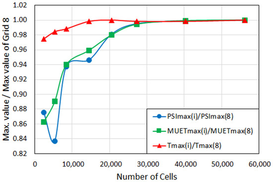 The density of the Newtonian gas mixture was calculated by assuming an ideal gas, neglecting the volume occupied by particles. A low Mach number flow was considered. Viscous dissipation and gravity were neglected. The molecular Lewis numbers of all of the gaseous species in the mixture were assumed to be unity [40]. The temperature dependence of the material properties was considered with fourth-order polynomials. In calculating the material properties, a turbulence interaction was omitted. Similarly, turbulent fluctuations were omitted when calculating the temperature-dependent terms of the radiation transport equation.