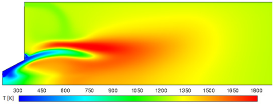 In the above equations, ρ, μ, Pr, Sc, ui, p, h, and Yk denote the density, molecular viscosity, molecular Prandtl number, molecular Schmidt number, velocity vector, static pressure, standardized specific enthalpy, and the mass fraction of gas species k, respectively [40]. The terms , , and denote the Reynolds stress tensor and the Reynolds flux vectors for enthalpy and species mass fraction, respectively. The source terms Sm, , Sh, and take the interaction of the gas phase with the particle phase into account, while SR considers the radiation in the energy balance, and Ωk expresses the conversion of species k by the gas phase chemical reactions.
