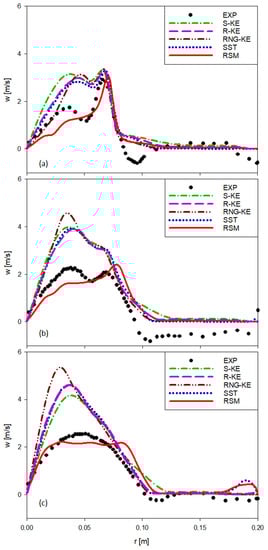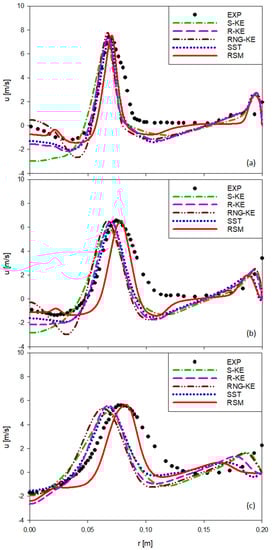 The velocity–pressure coupling was conducted using the SIMPLEC pressure-correction procedure [36]. A body force-weighted interpolation was used for the pressure. For the discretization of the convective terms of all transport equations, the formally third-order accurate QUICK upwind scheme [37] was principally applied, with two exceptions: For the transport equations of the Reynolds stress components and for the SST model, the Power Law scheme [38] had to be used to obtain a steady-state converged solution for the RANS model. The gradient computation technique was least squares cell-based. Stabilization was achieved by having a standard cell face the slope limiter.
