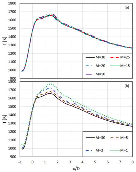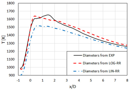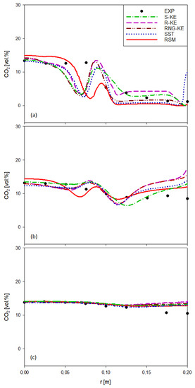 The calculation of the time-averaged species conversion rates via Equation (28) based on EDM is a quite simplistic approach for the consideration of the turbulence–chemistry interaction. Among the more sophisticated approaches, flamelet-based methods, which have a longer tradition in certain applications such as gas turbine combustion [6], offer an attractive alternative since they can incorporate detailed chemistry at comparably low computational costs and can provide better accuracy (especially for species governed by fast reactions). Recently, the flamelet method has been extended to pulverized coal, and flamelet-based approaches are being used to simulate pulverized coal flames [30,31]. However, since the main focus of the present work has been the turbulence modelling, i.e., the relative assessment of turbulence models, and the discretization of the particle phase, the present EDM-based combustion model was found to be sufficient.