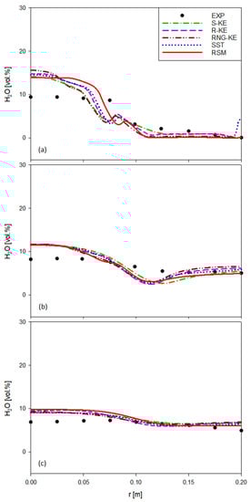 where σRSM is taken to be equal to 0.82, and θij denotes the so-called pressure–strain term. The latter is modelled as a complex function of Reynolds stresses, rate of strain, and rate of rotation tensors. Presently, the model by Speziale et al. [50] is used for its modelling. The model needs the ε field to be closed, which is obtained from the solution of the modelled transport equation for ε (Equation (16)), with the constants of S-KE. Along with the wall-functions method [46], the wall boundary conditions for the Reynolds stresses are obtained by solving a transport equation for k, which is principally equivalent to the one depicted above for S-KE. In using RSM, the Reynolds fluxes that are needed to calculate heat and mass transfer are still obtained based on the gradient-diffusion hypotheses (Equations (10) and (11)).