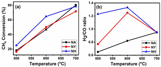 5 wt% Ni supported over γ-Al2O3, Y-zeolite and H-ZSM-5 catalysts (for simplification, these catalysts are designated as NA, NY and NH, respectively) were studied for DRM reaction at different temperatures from 500 to 700 °C. Figure 1a,b shows activity performance in terms of CH4 conversion and H2/CO ratios versus temperature for the NA, NY, and NH catalysts, respectively. The activity results demonstrate an increase in CH4 conversion with increase in reaction temperature from 500 to 700 °C which confirms the endothermic nature of DRM reaction [30,31]. The ratios of H2 to CO show interesting trends for each catalyst. It is noteworthy that CH4 conversion is mainly responsible for H2 production while CO comes from CO2. Hence, H2/CO ratios less than unity clearly justifies CO2 conversions are higher than CH4 conversion and vice versa. CO2 conversions higher than CH4 conversions also proves the occurrence of reverse water gas shift reaction (CO2 + H2 ↔ CO + H2O) which consumes H2 and brings H2/CO ratios less than one. This also suggests that H2/CO ratios higher than one, resulting from higher CH4 conversions, lead to the catalysts being more prone to carbon deposition [31].