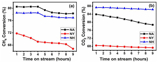 (a) CH4 and (b) CO2 conversion versus time on stream for Ni supported on alumina (NA), Ni supported on Y-zeolite (NY), and Ni supported on H-ZSM-5 (NH) catalysts.
