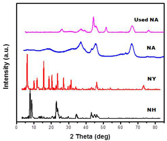 In order to estimate the crystallinity and different phases of the as-synthesized catalysts, X-ray diffraction (XRD) study was conducted over NA, NY and NH fresh catalysts and NA used catalyst. From Figure 3, the characteristic peaks of NiO were found over all the catalysts at two theta values of 44 and 63° (JCPDS: 01-073-1519), except for the fact that NY and NH catalysts showed additional peak of NiO at 37° (JCPDS: 01-073-1519). The peaks at 42 and 66° in the case of NA catalysts are characteristics of alumina support (JCPDS: 00-004-0875). The diffraction peaks had higher intensities in case of NY and NH catalysts as compared with NA catalyst showing higher crystallinity of the former catalysts. The NA catalyst after reaction revealed the formation of carbon during reaction as indicated by strong diffraction peak at 26° associated with graphite. Moreover, in addition to Ni0, the NA catalyst after reaction also showed a characteristic peak of spinel NiAl2O4 (JCPDS: 01-073-0239) at 45 and 78°.