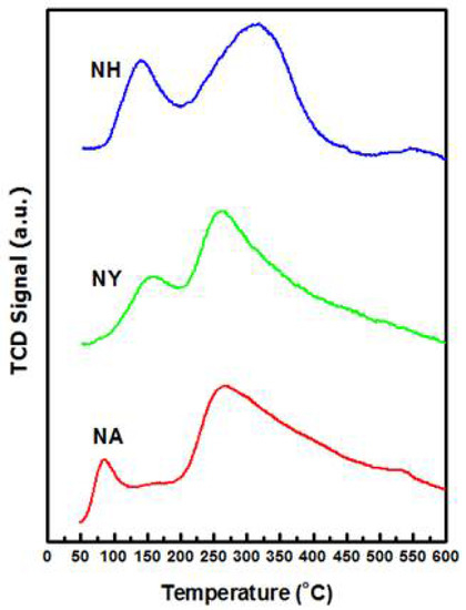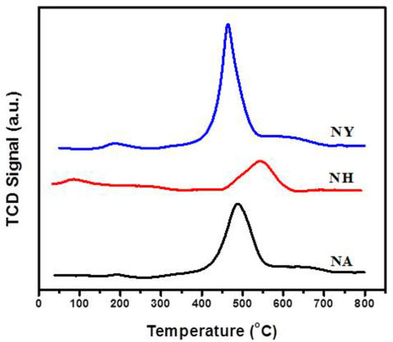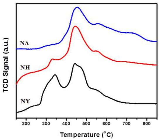 The extent of basic sites and their strength for fresh NA, NY, and NH catalysts was measured by employing temperature-programmed desorption (TPD) using CO2. The basicity of the catalyst is found to influence the carbon deposition and a higher number of basic sites led to lesser amount of carbon deposition [38]. The enhanced basicity promotes CO2 activation over the surface of the catalyst which reacts with carbon formed due to side reactions. Consequently, reverse Boudouard reaction (2CO ⇌ CO2 + C) converts the carbonaceous species into CO. Hence, the catalyst with higher basicity is expected to show the minimum carbon deposition. CO2-TPD profiles are shown in Figure 6 for fresh NA, NY, and NH catalysts.
