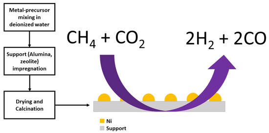 In order to synthesize 5 wt% nickel-based catalysts, nitrate salt precursor [(Ni(NO3)2·6H2O)] was wet impregnated over different supports including Y-zeolite (Y), H-ZSM-5 (H) and alumina (A) to synthesize catalysts denoted as NY, NH, and NA, where N represents 5 wt% Ni and Y, and H and A represent respective supports. Briefly, 30 mL of 28 mM of nickel precursor solution were added dropwise to a suspension of the individual oxide supports (33 g/L) in deionized water stirred with magnetic bar at 300 rpm. This process was carried out at 60 °C. The catalysts were subsequently dried overnight (12 h) at 110 °C under atmospheric before being subjected to calcination at 500 °C in MTI®® furnace for 3 h under air atmosphere. The catalyst preparation steps and DRM over catalyst surface are pictorially depicted in Scheme 1.