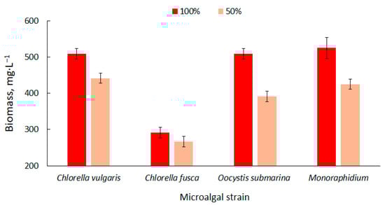 The biomass content in the particular photobioreactors was presented in Figure 1. Higher values were observed at the 100% dose of nutrient solution. The biomass content ranged from 292 ± 14 mg·L−1 for C. fusca to 525 ± 29 mg·L−1 for Monoraphidium. These values correspond with results available in the literature []. Biomass production can be increased using nutrient-rich culture media [] but the results are not always positive. In a study carried out by Sacristán et al. [], increase in nutrient content in culture medium had a negative impact on the growth and development of Scenedesmus acutus. This could be associated with the high pH in the culture medium and the presence of toxins in the wastewater used in the cultivation.